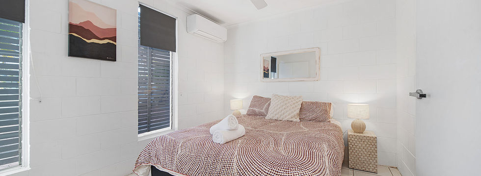Spacious downstairs apartment featuring 2 large bedrooms, each with a Queen Size Ensemble bed. The very large undercover patio adjoins a tropical garden with the area being totally fenced. There is an enclosed entry foyer for storage of bikes, beach gear or other oversize items. All rooms are air conditioned and have ceiling fans.